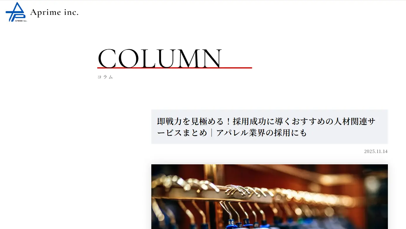 アパレル業界に強い転職エージェントである株式会社アプライムの運営するコラム内の記事「即戦力を見極める!採用成功に導くおすすめの人材関連サービスまとめ|アパレル業界の採用にも」に当社が掲載されました。