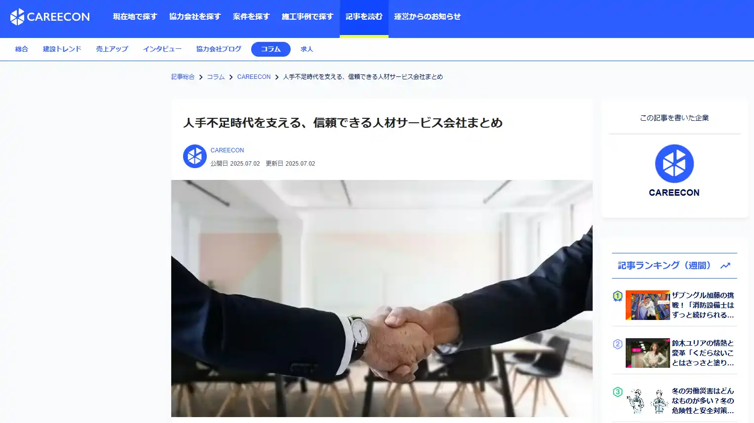 BRANU株式会社の運営する建設業界向けマッチングサービス「CAREECON」内の記事「人手不足時代を支える、信頼できる人材サービス会社まとめ」に当社が掲載されました。